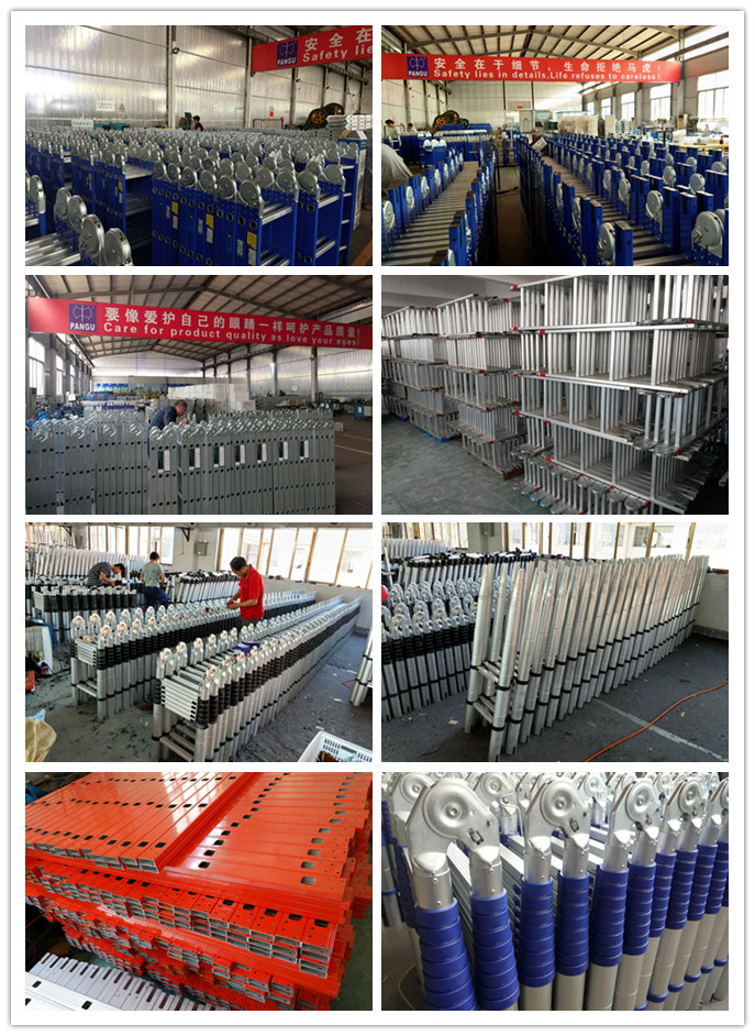 3. Aluminium ladders: PANGU have telescopic ladder, multi purpose ladder, step ladder, combination ladder, steel ladder, all ladders with EN131, multi purpose ladder 4X3 have GS certificate. We have our aluminium profile factory, mold workshop, all parts are produced in our factory.
